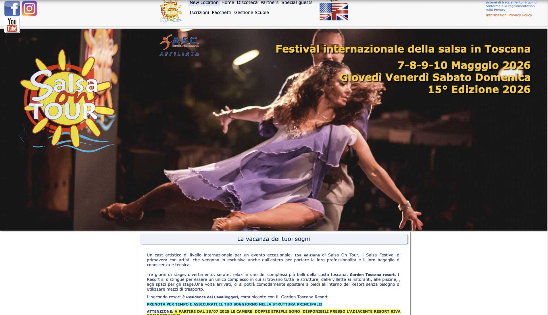 Tre giorni di stage, divertimento, serate, relax in uno dei complessi più belli della costa toscana, Garden Toscana resort. Il Resort si distingue per essere un unico complesso in cui si trovano tutte le strutture, dalle villette ai ristoranti, alle piscine, , agli spazi per gli stage.Una volta arrivati, ci si potrà comodamente spostare a piedi all’interno del Resort senza bisogno di utilizzare mezzi di trasporto.